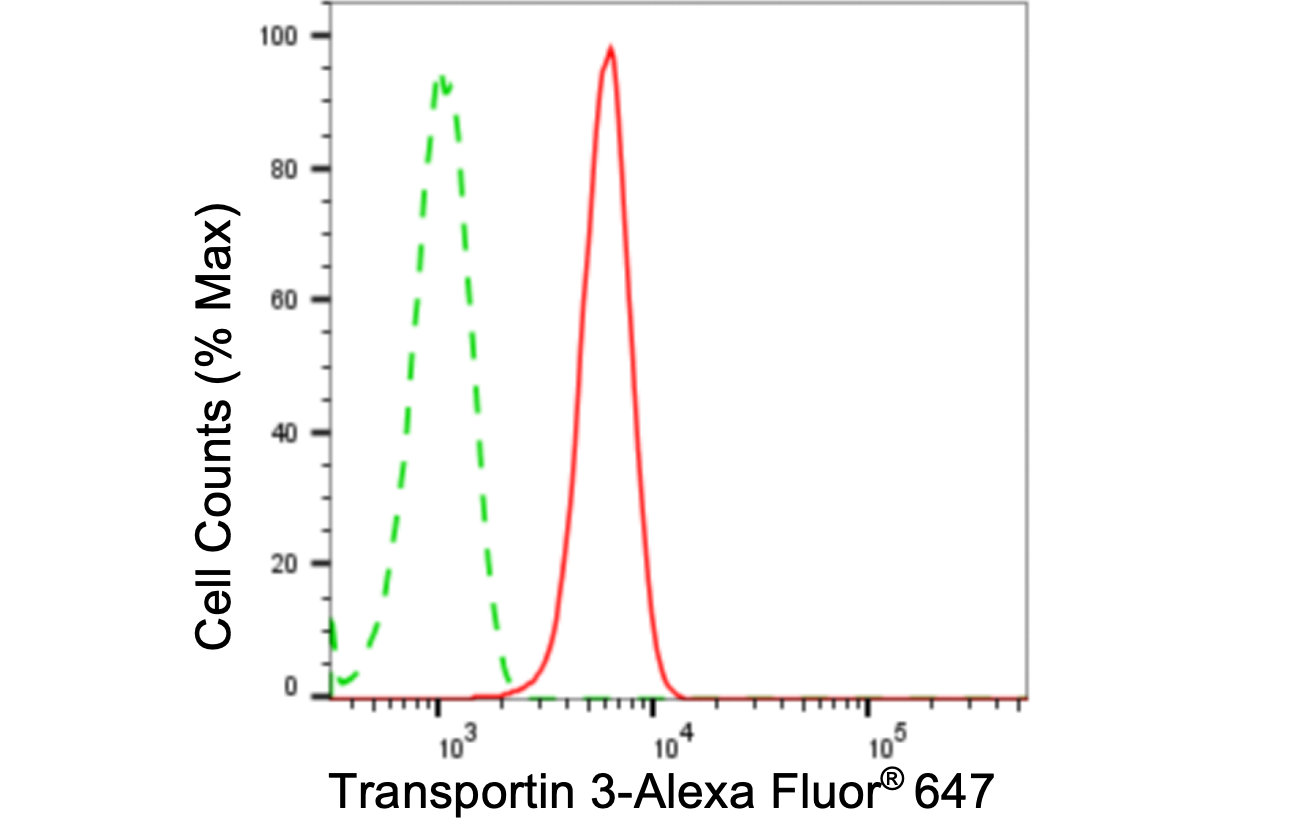 Flow cytometric analysis of transportin 3 expression in HepG2 cells using transportin 3 antibody. Green, isotype control; red, transportin 3.