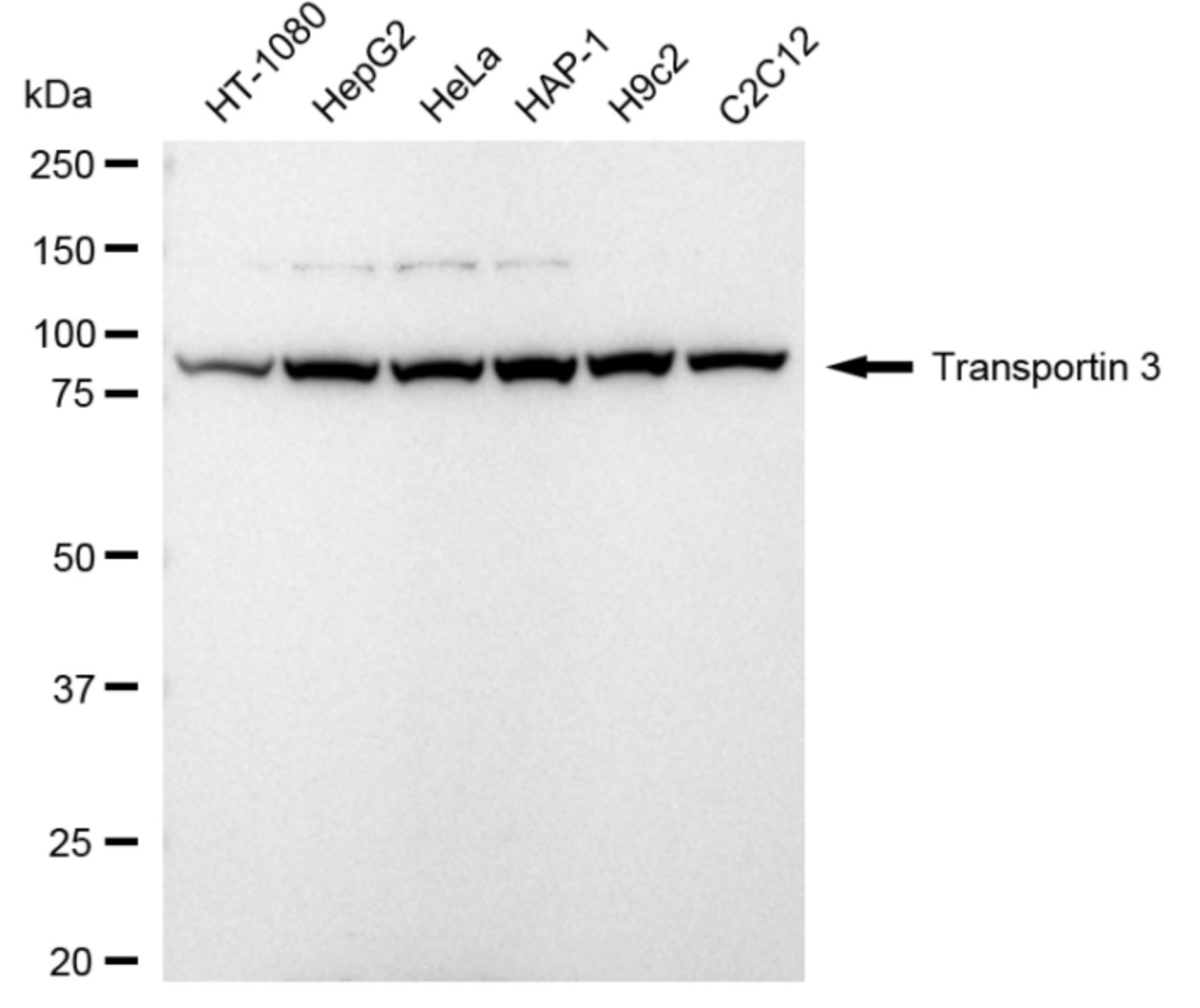 Western blotting analysis using transportin 3 antibody. Total cell lysates (30 μg) from various cell lines were loaded and separated by SDS-PAGE. The blot was incubated with transportin 3 antibody and HRP-conjugated goat anti-rabbit secondary antibody respectively.