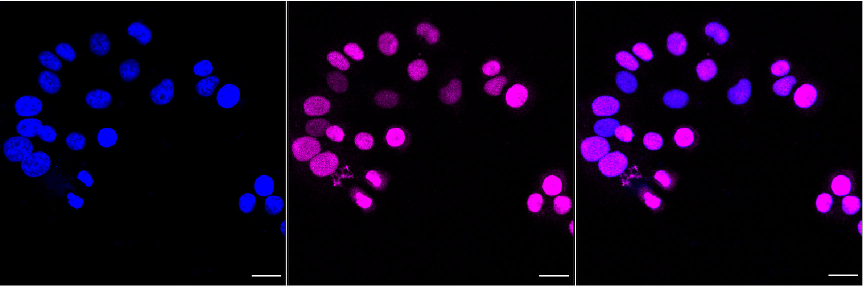 Immunocytochemical staining of HepG2 cells with DNA topoisomerase II alpha antibody. Nuclei were stained blue with DAPI; DNA topoisomerase II alpha was stained magenta with Alexa Fluor? 647. Images were taken using Leica stellaris 5. Protein abundance based on laser Intensity and smart gain: Medium. Scale bar, 20 μm.
