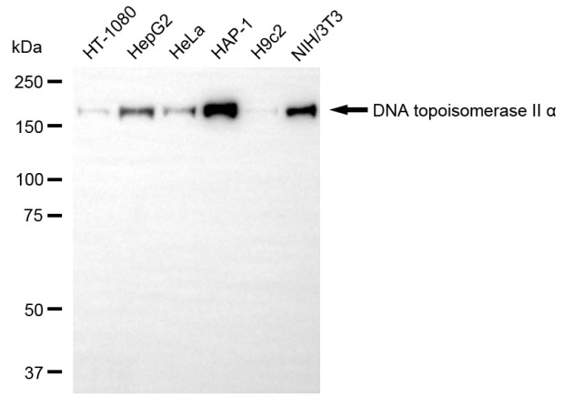 Western blotting analysis using DNA topoisomerase II alpha antibody. Total cell lysates (30 μg) from various cell lines were loaded and separated by SDS-PAGE. The blot was incubated with DNA topoisomerase II alpha antibody and HRP-conjugated goat anti-rabbit secondary antibody respectively.