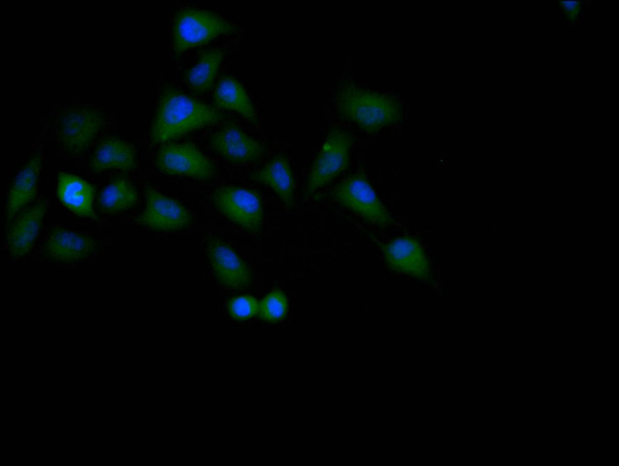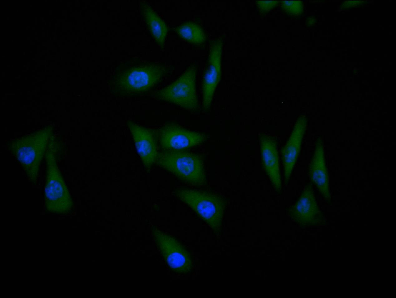 Immunofluorescence staining of Hela cell with CSB-RA024077MA1HU at 1:60, counter-stained with DAPI. The cells were fixed in 4% formaldehyde and blocked in 10% normal Goat Serum. The cells were then incubated with the antibody overnight at 4C. The secondary antibody was Alexa Fluor 488-congugated AffiniPure Goat Anti-Rabbit IgG(H+L).