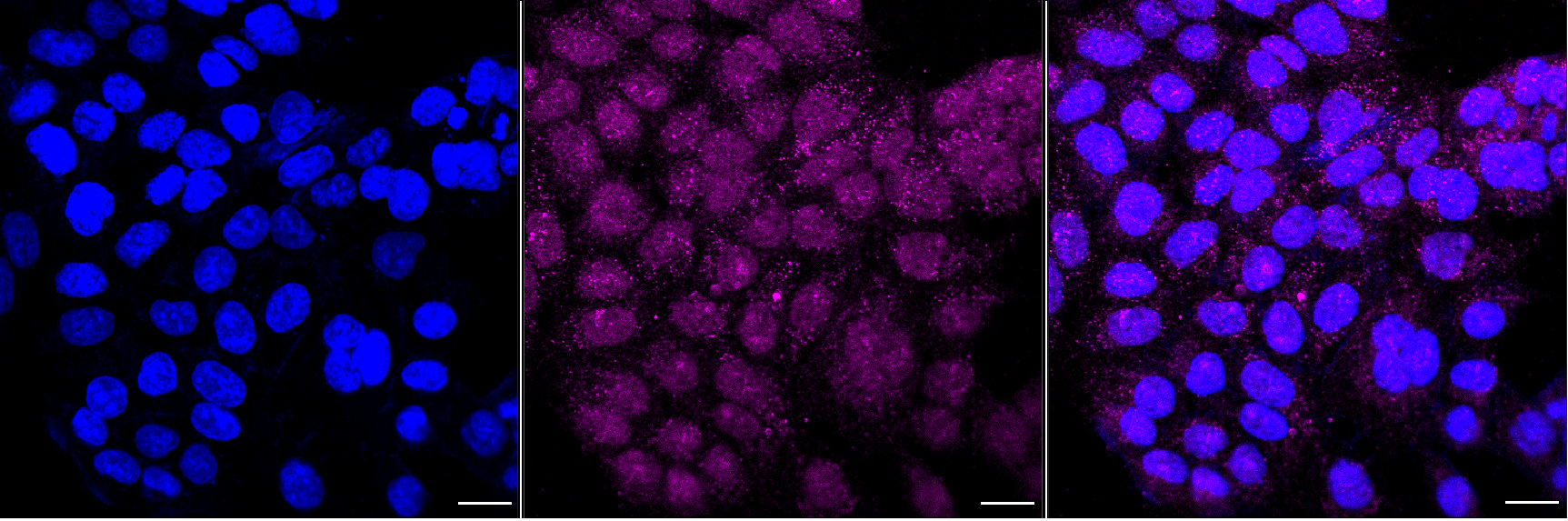 Immunocytochemical staining of HAP-1 cells with Trophoblast glycoprotein antibody. Nuclei were stained blue with DAPI; Trophoblast glycoprotein was stained magenta with Alexa Fluor? 647. Images were taken using Leica stellaris 5. Protein abundance based on laser Intensity and smart gain: Medium. Scale bar, 20 μm.