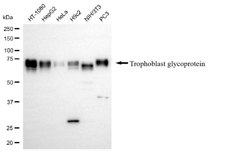 Western blotting analysis using trophoblast glycoprotein antibody. Total cell lysates (30 μg) from various cell lines were loaded and separated by SDS-PAGE. The blot was incubated with trophoblast glycoprotein antibody and HRP-conjugated goat anti-rabbit secondary antibody respectively.