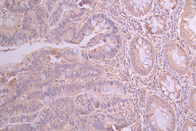 IHC image of CSB-RA295233A0HU diluted at 1:100 and staining in paraffin-embedded human colorectal cancer performed on a Leica BondTM system. After dewaxing and hydration, antigen retrieval was mediated by high pressure in a citrate buffer (pH 6.0). Section was blocked with 10% normal goat serum 30min at RT. Then primary antibody (1% BSA) was incubated at 4°C overnight. The primary is detected by a Goat anti-rabbit polymer IgG labeled by HRP and visualized using 0.05% DAB.