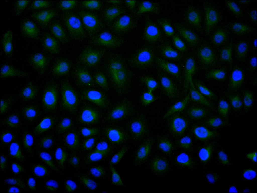 Immunofluorescence staining of Hela cell with CSB-RA048528A0HU at 1:50, counter-stained with DAPI. The cells were fixed in 4% formaldehyde, permeabilized using 0.2% Triton X-100 and blocked in 10% normal Goat Serum. The cells were then incubated with the antibody overnight at 4°C. The secondary antibody was Alexa Fluor 488-congugated AffiniPure Goat Anti-Rabbit IgG(H+L).
