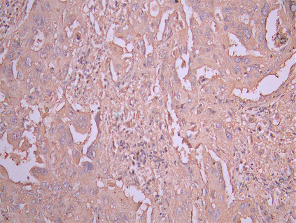 IHC image of CSB-RA343033MA1HU diluted at 1:50 and staining in paraffin-embedded human lung cancer performed on a Leica BondTM system. After dewaxing and hydration, antigen retrieval was mediated by high pressure in a citrate buffer (pH 6.0). Section was blocked with 10% normal goat serum 30min at RT. Then primary antibody (1% BSA) was incubated at 4°C overnight. The primary is detected by a Anti-Human lgG, Fcy Fragment Specific labeled by HRP and visualized using 0.05% DAB.