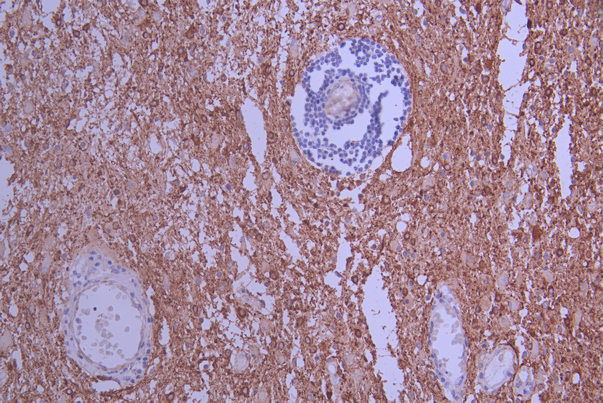 IHC image of CSB-RA176457A0HU diluted at 1:100 and staining in paraffin-embedded human glioma cancer performed on a Leica BondTM system. After dewaxing and hydration, antigen retrieval was mediated by high pressure in a citrate buffer (pH 6.0). Section was blocked with 10% normal goat serum 30min at RT. Then primary antibody (1% BSA) was incubated at 4°C overnight. The primary is detected by a Goat anti-rabbit polymer IgG labeled by HRP and visualized using 0.05% DAB.
