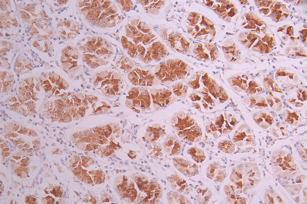 IHC image of CSB-RA176457A0HU diluted at 1:100 and staining in paraffin-embedded human stomach tissue performed on a Leica BondTM system. After dewaxing and hydration, antigen retrieval was mediated by high pressure in a citrate buffer (pH 6.0). Section was blocked with 10% normal goat serum 30min at RT. Then primary antibody (1% BSA) was incubated at 4°C overnight. The primary is detected by a Goat anti-rabbit polymer IgG labeled by HRP and visualized using 0.05% DAB.