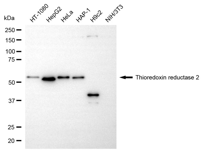 Western blotting analysis using thioredoxin reductase 2 antibody. Total cell lysates (30 μg) from various cell lines were loaded and separated by SDS-PAGE. The blot was incubated with thioredoxin reductase 2 antibody and HRP-conjugated goat anti-rabbit secondary antibody respectively.