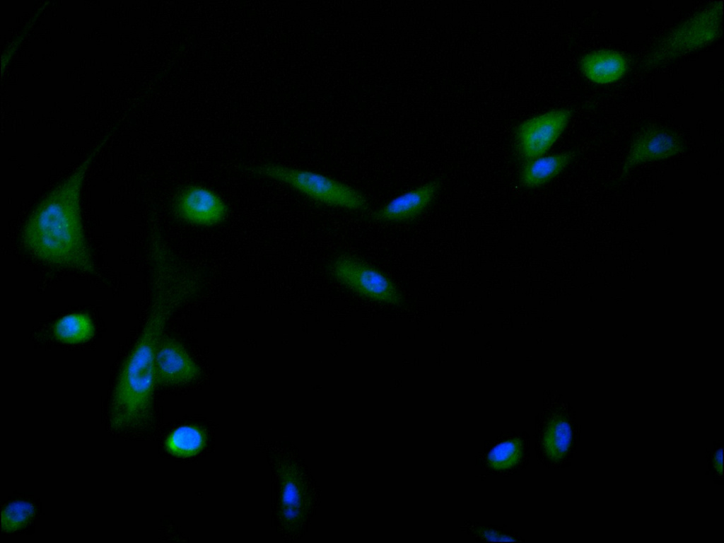 Immunofluorescence staining of PC-3 cell with CSB-RA105164A0HU at 1:50, counter-stained with DAPI. The cells were fixed in 4% formaldehyde, permeabilized using 0.2% Triton X-100 and blocked in 10% normal Goat Serum. The cells were then incubated with the antibody overnight at 4°C. The secondary antibody was Alexa Fluor 488-congugated AffiniPure Goat Anti-Rabbit IgG(H+L).