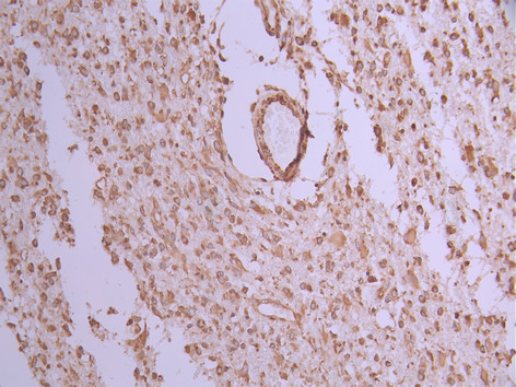 IHC image of CSB-RA786302A0HU diluted at 1:100 and staining in paraffin-embedded human glioma cancer performed on a Leica BondTM system. After dewaxing and hydration, antigen retrieval was mediated by high pressure in a citrate buffer (pH 6.0). Section was blocked with 10% normal goat serum 30min at RT. Then primary antibody (1% BSA) was incubated at 4°C overnight. The primary is detected by a Goat anti-rabbit polymer IgG labeled by HRP and visualized using 0.05% DAB.