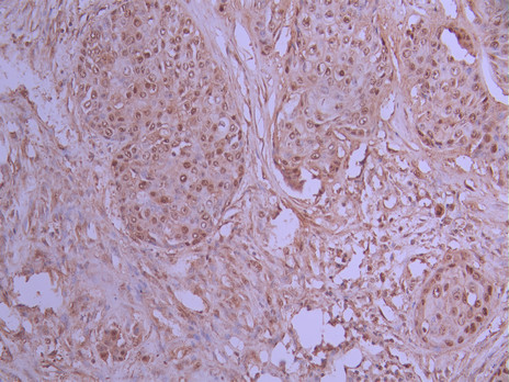 IHC image of CSB-RA912122A0HU diluted at 1:100 and staining in paraffin-embedded human pancreatic cancer performed on a Leica BondTM system. After dewaxing and hydration, antigen retrieval was mediated by high pressure in a citrate buffer (pH 6.0). Section was blocked with 10% normal goat serum 30min at RT. Then primary antibody (1% BSA) was incubated at 4°C overnight. The primary is detected by a Goat anti-rabbit polymer IgG labeled by HRP and visualized using 0.05% DAB.