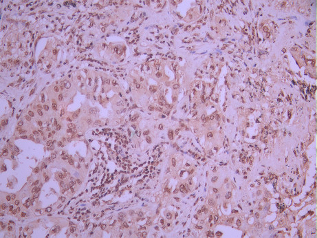 IHC image of CSB-RA012285A0HU diluted at 1:100 and staining in paraffin-embedded human lung cancer performed on a Leica BondTM system. After dewaxing and hydration, antigen retrieval was mediated by high pressure in a citrate buffer (pH 6.0). Section was blocked with 10% normal goat serum 30min at RT. Then primary antibody (1% BSA) was incubated at 4°C overnight. The primary is detected by a Goat anti-rabbit polymer IgG labeled by HRP and visualized using 0.05% DAB.