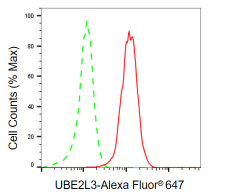 Flow cytometric analysis of UBE2L3 expression in HepG2 cells using UBE2L3 antibody. Green, isotype control; red, UBE2L3.