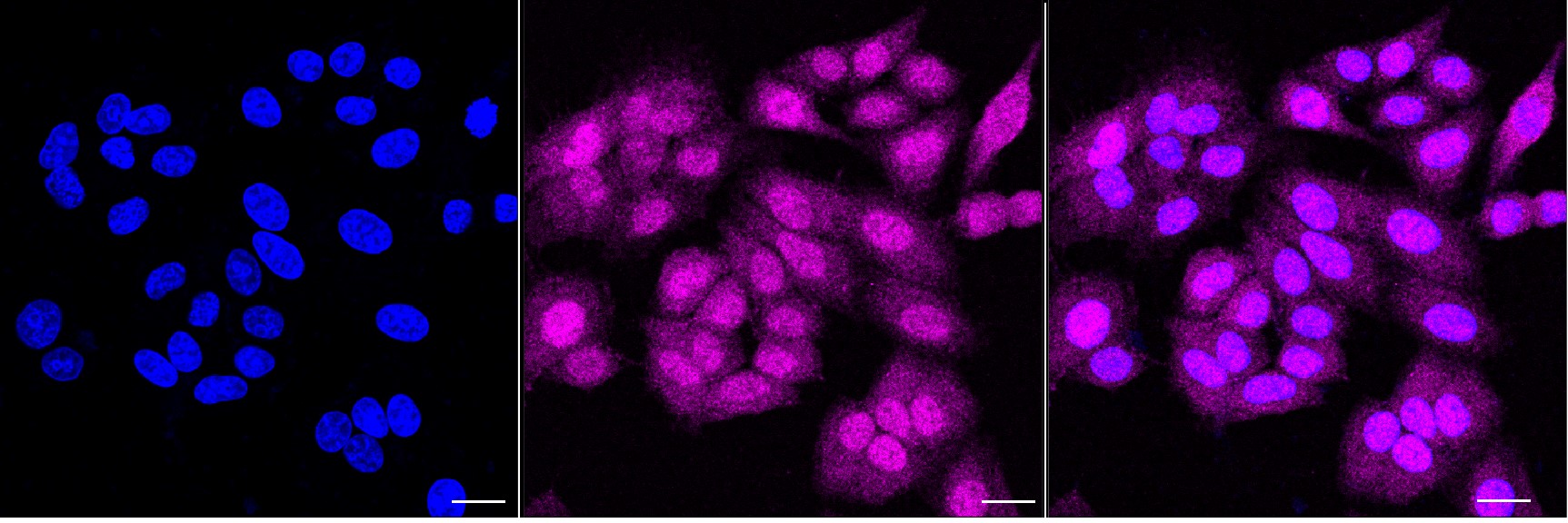 Immunocytochemical staining of HepG2 cells with UBE2L3 antibody. Nuclei were stained blue with DAPI; UBE2L3 was stained magenta with Alexa Fluor? 647. Images were taken using Leica stellaris 5. Protein abundance based on laser Intensity and smart gain: Medium. Scale bar, 20 μm.
