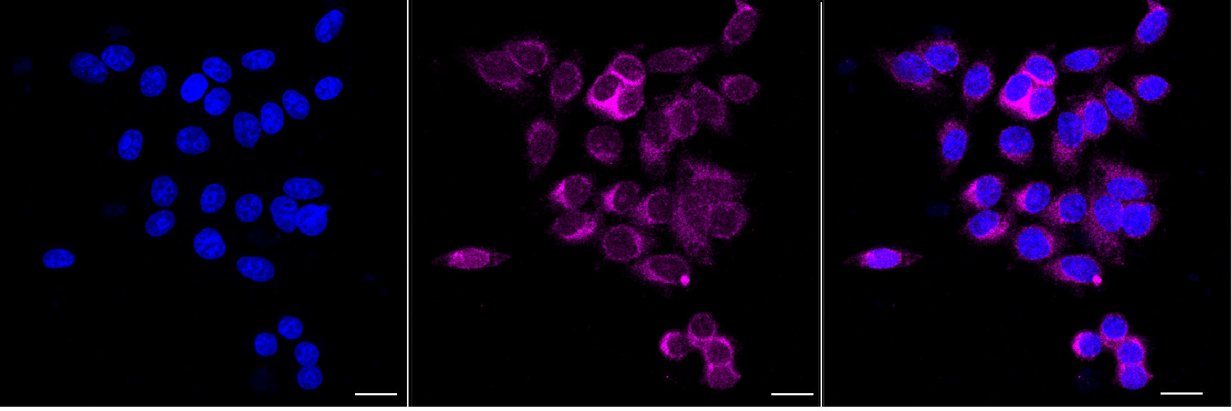 Immunocytochemical staining of HepG2 cells with ubiquitination factor E4 A antibody. Nuclei were stained blue with DAPI; Ubiquitination factor E4 A was stained magenta with Alexa Fluor? 647. Images were taken using Leica stellaris 5. Protein abundance based on laser Intensity and smart gain: Medium. Scale bar, 20 μm.