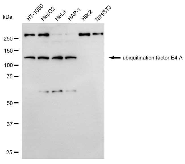 Western blotting analysis using ubiquitination factor E4 A antibody. Total cell lysates (30 μg) from various cell lines were loaded and separated by SDS-PAGE. The blot was incubated with ubiquitination factor E4 A antibody and HRP-conjugated goat anti-rabbit secondary antibody respectively.
