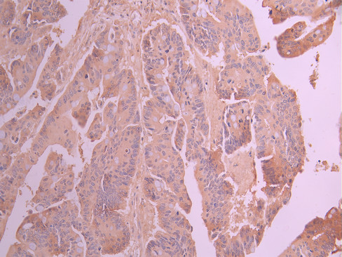 IHC image of CSB-RA969203A0HU diluted at 1:100 and staining in paraffin-embedded human colorectal cancer performed on a Leica BondTM system. After dewaxing and hydration, antigen retrieval was mediated by high pressure in a citrate buffer (pH 6.0). Section was blocked with 10% normal goat serum 30min at RT. Then primary antibody (1% BSA) was incubated at 4°C overnight. The primary is detected by a Goat anti-rabbit polymer IgG labeled by HRP and visualized using 0.05% DAB.