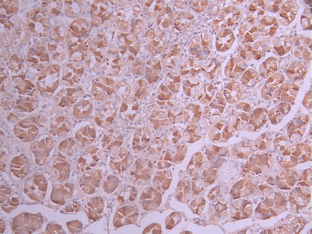 IHC image of CSB-RA969203A0HU diluted at 1:100 and staining in paraffin-embedded human stomach tissue performed on a Leica BondTM system. After dewaxing and hydration, antigen retrieval was mediated by high pressure in a citrate buffer (pH 6.0). Section was blocked with 10% normal goat serum 30min at RT. Then primary antibody (1% BSA) was incubated at 4°C overnight. The primary is detected by a Goat anti-rabbit polymer IgG labeled by HRP and visualized using 0.05% DAB.