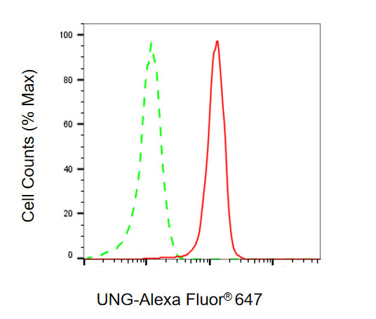 Flow cytometric analysis of UNG expression in HepG2 cells using UNG antibody. Green, isotype control; red, UNG.