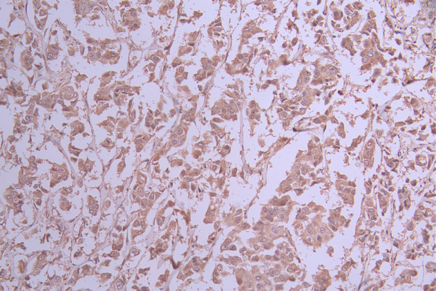 IHC image of CSB-RA928009A0HU diluted at 1:100 and staining in paraffin-embedded human breast cancer performed on a Leica BondTM system. After dewaxing and hydration, antigen retrieval was mediated by high pressure in a citrate buffer (pH 6.0). Section was blocked with 10% normal goat serum 30min at RT. Then primary antibody (1% BSA) was incubated at 4°C overnight. The primary is detected by a Goat anti-rabbit polymer IgG labeled by HRP and visualized using 0.05% DAB.