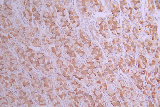 IHC image of CSB-RA928009A0HU diluted at 1:100 and staining in paraffin-embedded human stomach tissue performed on a Leica BondTM system. After dewaxing and hydration, antigen retrieval was mediated by high pressure in a citrate buffer (pH 6.0). Section was blocked with 10% normal goat serum 30min at RT. Then primary antibody (1% BSA) was incubated at 4°C overnight. The primary is detected by a Goat anti-rabbit polymer IgG labeled by HRP and visualized using 0.05% DAB.