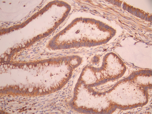IHC image of CSB-RA990355A0HU diluted at 1:100 and staining in paraffin-embedded human gastric cancer performed on a Leica BondTM system. After dewaxing and hydration, antigen retrieval was mediated by high pressure in a citrate buffer (pH 6.0). Section was blocked with 10% normal goat serum 30min at RT. Then primary antibody (1% BSA) was incubated at 4°C overnight. The primary is detected by a Goat anti-rabbit polymer IgG labeled by HRP and visualized using 0.05% DAB.