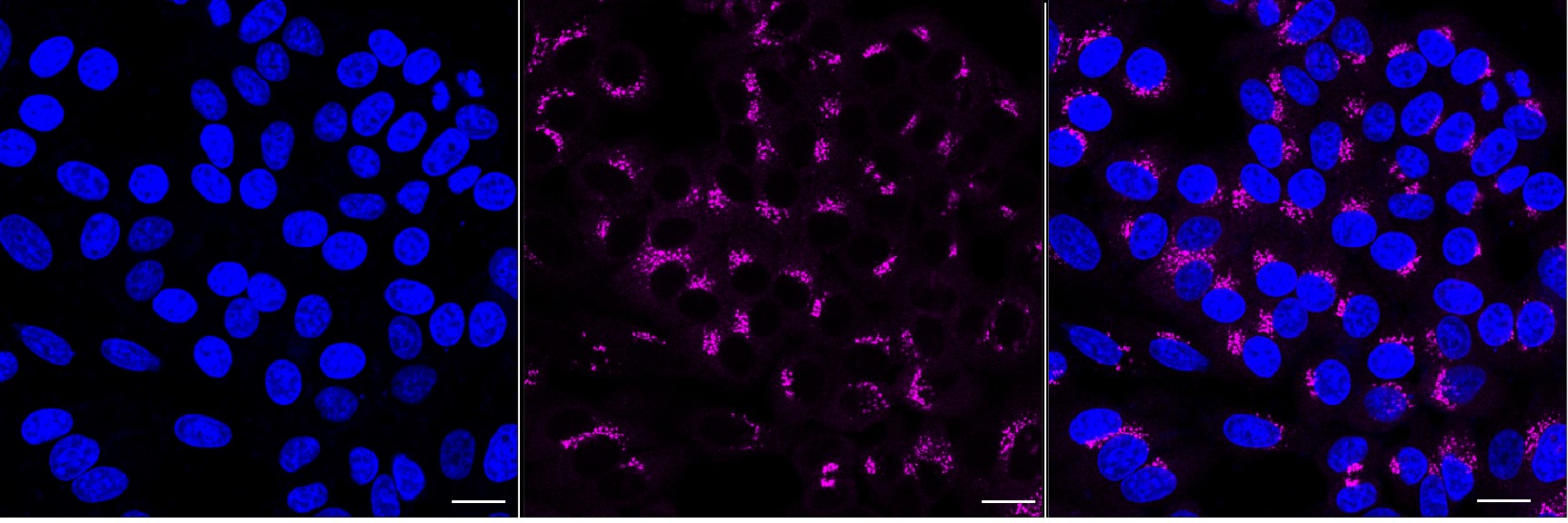 Immunocytochemical staining of HepG2 cells with USO1 antibody. Nuclei were stained blue with DAPI; USO1 was stained magenta with Alexa Fluor? 647. Images were taken using Leica stellaris 5. Protein abundance based on laser Intensity and smart gain: Medium. Scale bar, 20 μm.