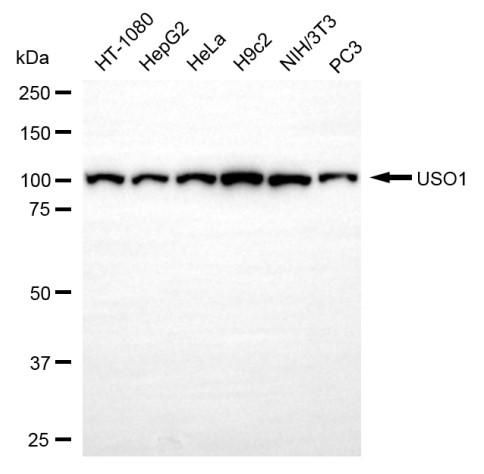 Western blotting analysis using USO1 antibody. Total cell lysates (30 μg) from various cell lines were loaded and separated by SDS-PAGE. The blot was incubated with USO1 antibody and HRP-conjugated goat anti-rabbit secondary antibody respectively.