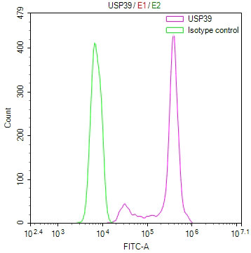 Overlay Peak curve showing Hela cells stained with CSB-RA073613A0HU (red line) at 1:100. The cells were fixed in 4% formaldehyde and permeated by 0.2% TritonX-100 for 10min. Then 10% normal goat serum to block non-specific protein-protein interactions followed by the antibody (1ug/1*106cells) for 45min at 4℃. The secondary antibody used was FITC-conjugated goat anti-rabbit IgG (H+L) at 1/200 dilution for 35min at 4℃.Control antibody (green line) was Rabbit IgG (1ug/1*106cells) used under the same conditions. Acquisition of >10, 000 events was performed.