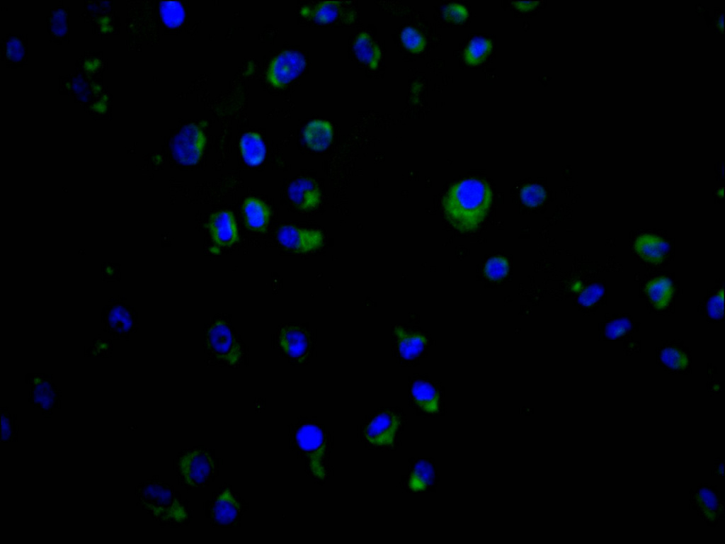 Immunofluorescence staining of Hela cell with CSB-RA445470A0HU at 1:50, counter-stained with DAPI. The cells were fixed in 4% formaldehyde and blocked in 10% normal Goat Serum. The cells were then incubated with the antibody overnight at 4°C. The secondary antibody was Alexa Fluor 488-congugated AffiniPure Goat Anti-Rabbit IgG(H+L).