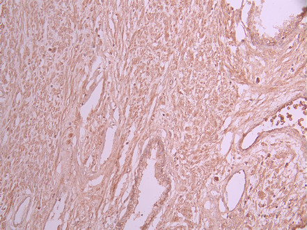 IHC image of CSB-RA445470A0HU diluted at 1:100 and staining in paraffin-embedded human prostate cancer performed on a Leica BondTM system. After dewaxing and hydration, antigen retrieval was mediated by high pressure in a citrate buffer (pH 6.0). Section was blocked with 10% normal goat serum 30min at RT. Then primary antibody (1% BSA) was incubated at 4°C overnight. The primary is detected by a Goat anti-rabbit polymer IgG labeled by HRP and visualized using 0.05% DAB.