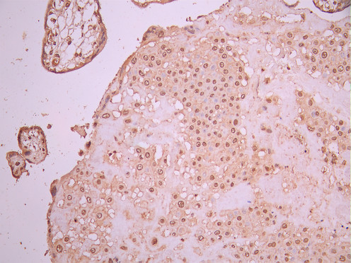 IHC image of CSB-RA896869MA2HU diluted at 1:50 and staining in paraffin-embedded human placenta tissue performed on a Leica BondTM system. After dewaxing and hydration, antigen retrieval was mediated by high pressure in a citrate buffer (pH 6.0). Section was blocked with 10% normal goat serum 30min at RT. Then primary antibody (1% BSA) was incubated at 4°C overnight. The primary is detected by a Anti-Human lgG, Fcy Fragment Specific labeled by HRP and visualized using 0.05% DAB.