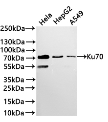 別名:5''-deoxyribose-5-phosphate lyase Ku70 antibody; 5''-dRP lyase Ku70 antibody; 70 kDa subunit of Ku antigen antibody; ATP dependent DNA helicase 2 subunit 1 antibody; ATP dependent DNA helicase II 70 kDa subunit antibody; ATP-dependent DNA helicase 2 subunit 1 antibody; ATP-dependent DNA helicase II 70 kDa subunit antibody; CTC box binding factor 75 kDa subunit antibody; CTC box-binding factor 75 kDa subunit antibody; CTC75 antibody; CTCBF antibody; DNA repair protein XRCC6 antibody; G22P1 antibody; Ku 70 antibody; Ku autoantigen p70 subunit antibody; Ku autoantigen, 70kDa antibody; Ku p70 antibody; Ku70 antibody; Ku70 DNA binding component of DNA-dependent proteinkinase complex (thyroid autoantigen 70 kDa antibody; Kup70 antibody; Lupus Ku autoantigen protein p70 antibody; ML8 antibody; Thyroid autoantigen 70kD (Ku antigen) antibody; Thyroid autoantigen antibody; Thyroid lupus autoantigen antibody; Thyroid lupus autoantigen p70 antibody; Thyroid-lupus autoantigen antibody; TLAA antibody; X ray repair complementing defective repair in Chinese hamster cells 6 antibody; X-ray repair complementing defective repair in Chinese hamster cells 6 antibody; X-ray repair cross-complementing protein 6 antibody; XRCC 6 antibody; Xrcc6 antibody; XRCC6_HUMAN antibody