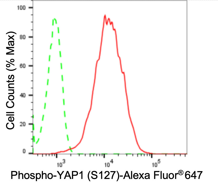 Flow cytometric analysis of phospho-YAP1 (S127) expression in HepG2 cells using phospho-YAP1 (S127) antibody. Green, isotype control; red, phospho-YAP1 (S127).