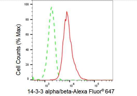 Flow cytometric analysis of 14-3-3 alpha/beta expression in HepG2 cells using 14-3-3 alpha/beta antibody. Green, isotype control; red, 14-3-3 alpha/beta.