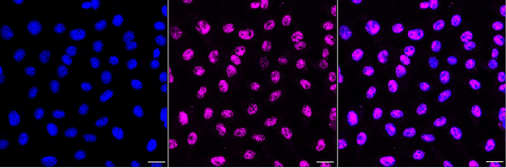 Immunocytochemical staining of C2C12 cells with ZEB1 antibody. Nuclei were stained blue with DAPI; ZEB1 was stained magenta with Alexa Fluor? 647. Images were taken using Leica stellaris 5. Protein abundance based on laser Intensity and smart gain: Medium. Scale bar, 20 μm.