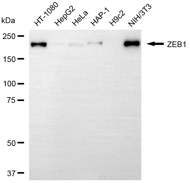 Western blotting analysis using ZEB1 antibody. Total cell lysates (30 μg) from various cell lines were loaded and separated by SDS-PAGE. The blot was incubated with ZEB1 antibody and HRP-conjugated goat anti-rabbit secondary antibody respectively.