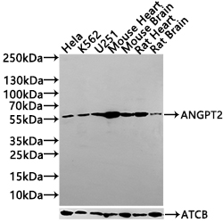 Positive WB detected in: Hela whole cell lysate(30μg), K562 whole cell lysate(30μg), U251 whole cell lysate(30μg),Mouse Heart tissue lysate(30μg),Mouse Brain tissue lysate(30μg),Rat Heart tissue lysate(30μg),Rat Brain tissue lysate(30μg)