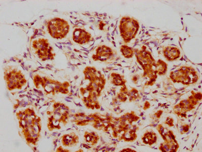 IHC image of CSB-RA002531A0HU diluted at 1:73.75 and staining in paraffin-embedded human breast cancer performed on a Leica BondTM system. After dewaxing and hydration, antigen retrieval was mediated by high pressure in a citrate buffer (pH 6.0). Section was blocked with 10% normal goat serum 30min at RT. Then primary antibody (1% BSA) was incubated at 4℃ overnight. The primary is detected by a biotinylated secondary antibody and visualized using an HRP conjugated SP system.