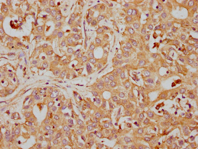 IHC image of CSB-RA004950A0HU diluted at 1:155 and staining in paraffin-embedded human liver cancer performed on a Leica BondTM system. After dewaxing and hydration, antigen retrieval was mediated by high pressure in a citrate buffer (pH 6.0). Section was blocked with 10% normal goat serum 30min at RT. Then primary antibody (1% BSA) was incubated at 4℃ overnight. The primary is detected by a biotinylated secondary antibody and visualized using an HRP conjugated SP system.