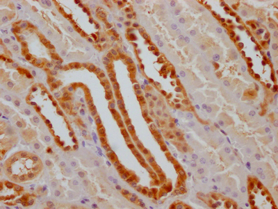 IHC image of CSB-RA178104A0HU diluted at 1:100 and staining in paraffin-embedded human kidney tissue performed on a Leica BondTM system. After dewaxing and hydration, antigen retrieval was mediated by high pressure in a citrate buffer (pH 6.0). Section was blocked with 10% normal goat serum 30min at RT. Then primary antibody (1% BSA) was incubated at 4℃ overnight. The primary is detected by a Goat anti-rabbit IgG polymer labeled by HRP and visualized using 0.05% DAB.