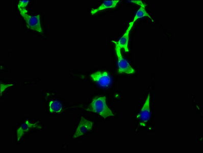 Immunofluorescence staining of NIH/3T3 cells with CSB-RA011087A0HU at 1:26, counter-stained with DAPI. The cells were fixed in 4% formaldehyde, permeabilized using 0.2% Triton X-100 and blocked in 10% normal Goat Serum. The cells were then incubated with the antibody overnight at 4℃. The secondary antibody was Alexa Fluor 488-congugated AffiniPure Goat Anti-Rabbit IgG (H+L).