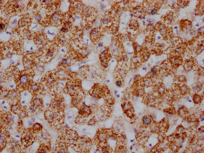 IHC image of CSB-RA953395A0HU diluted at 1:100 and staining in paraffin-embedded human liver tissue performed on a Leica BondTM system. After dewaxing and hydration, antigen retrieval was mediated by high pressure in a citrate buffer (pH 6.0). Section was blocked with 10% normal goat serum 30min at RT. Then primary antibody (1% BSA) was incubated at 4℃ overnight. The primary is detected by a Goat anti-rabbit IgG polymer labeled by HRP and visualized using 0.05% DAB.