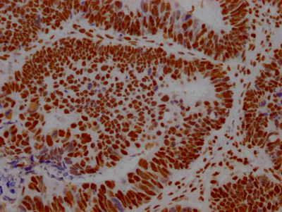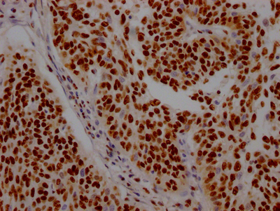 IHC image of CSB-RA289890A0HU diluted at 1:100 and staining in paraffin-embedded human cervical cancer performed on a Leica BondTM system. After dewaxing and hydration, antigen retrieval was mediated by high pressure in a citrate buffer (pH 6.0). Section was blocked with 10% normal goat serum 30min at RT. Then primary antibody (1% BSA) was incubated at 4℃ overnight. The primary is detected by a Goat anti-rabbit IgG polymer labeled by HRP and visualized using 0.05% DAB.
