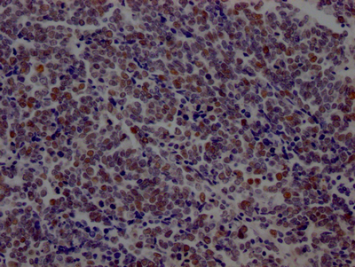 IHC image of CSB-RA877322A0HU diluted at 1:100 and staining in paraffin-embedded human lung cancer performed on a Leica BondTM system. After dewaxing and hydration, antigen retrieval was mediated by high pressure in a citrate buffer (pH 6.0). Section was blocked with 10% normal goat serum 30min at RT. Then primary antibody (1% BSA) was incubated at 4℃ overnight. The primary is detected by a Goat anti-rabbit IgG polymer labeled by HRP and visualized using 0.05% DAB.