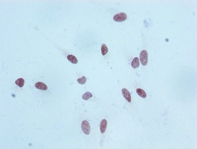 Immunocytochemistry analysis of CSB-RA010418A18me1HU diluted at 1:100 and staining in Hela cells performed on a Leica BondTM system. After dewaxing and hydration, antigen retrieval was mediated by high pressure in a citrate buffer (pH 6.0). Section was blocked with 10% normal goat serum 30min at RT. Then primary antibody (1% BSA) was incubated at 4℃ overnight. The primary is detected by a biotinylated secondary antibody and visualized using an HRP conjugated SP system.