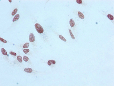 Immunocytochemistry analysis of CSB-RA010418A17me1HU diluted at 1:100 and staining in Hela cells performed on a Leica BondTM system. After dewaxing and hydration, antigen retrieval was mediated by high pressure in a citrate buffer (pH 6.0). Section was blocked with 10% normal goat serum 30min at RT. Then primary antibody (1% BSA) was incubated at 4℃ overnight. The primary is detected by a biotinylated secondary antibody and visualized using an HRP conjugated SP system.
