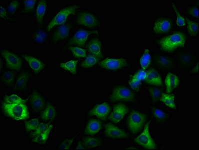 Immunofluorescence staining of Hela cells(treated with 50mM Calyculin A for 30min) with CSB-RA009963A09phHU at 1:100,counter-stained with DAPI. The cells were fixed in 4% formaldehyde, permeabilized using 0.2% Triton X-100 and blocked in 10% normal Goat Serum. The cells were then incubated with the antibody overnight at 4℃. The secondary antibody was Alexa Fluor 488-congugated AffiniPure Goat Anti-Rabbit IgG (H+L).
