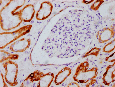 IHC image of CSB-RA009963A09phHU diluted at 1:100 and staining in paraffin-embedded human kidney tissue performed on a Leica BondTM system. After dewaxing and hydration, antigen retrieval was mediated by high pressure in a citrate buffer (pH 6.0). Section was blocked with 10% normal goat serum 30min at RT. Then primary antibody (1% BSA) was incubated at 4℃ overnight. The primary is detected by a biotinylated secondary antibody and visualized using an HRP conjugated SP system.